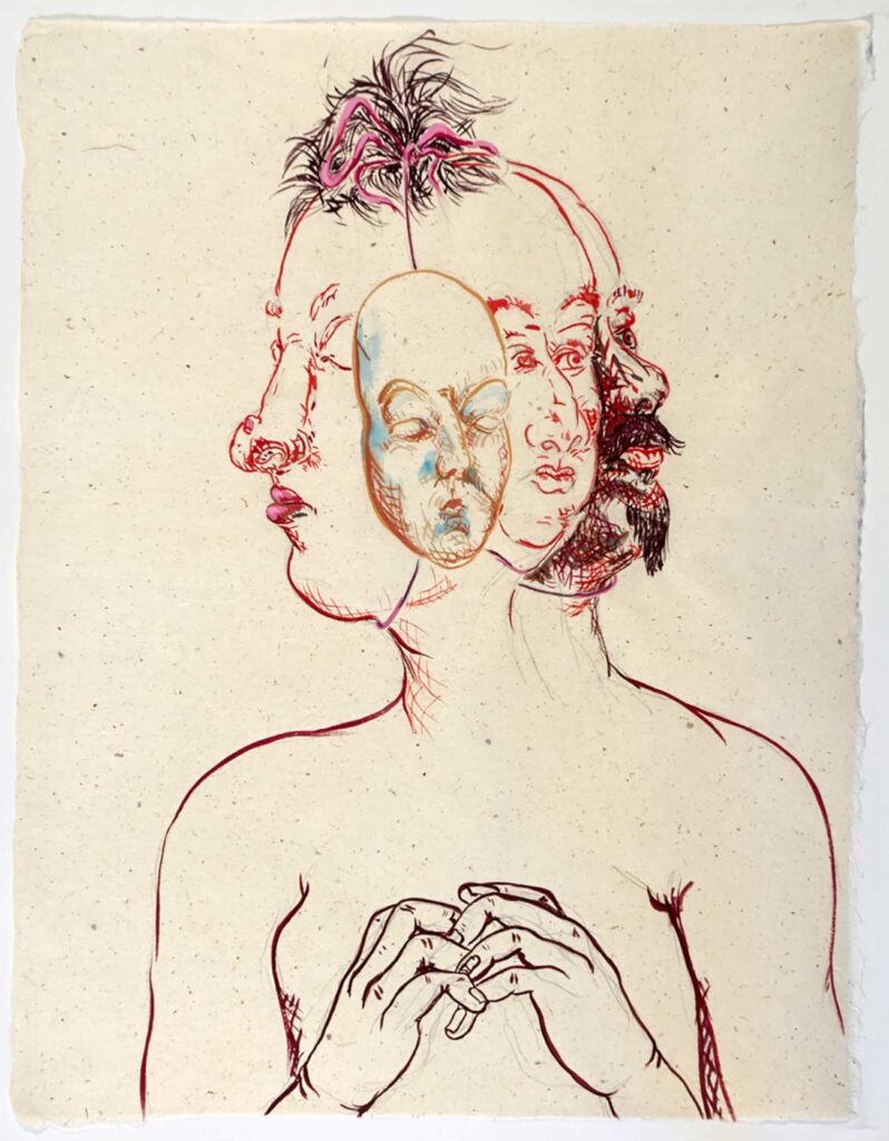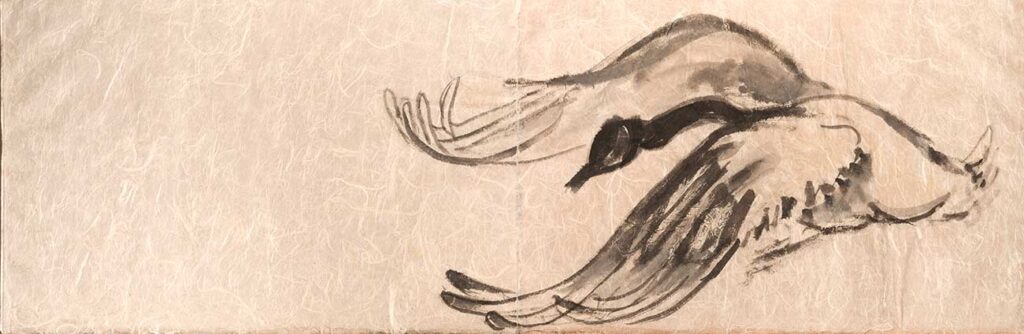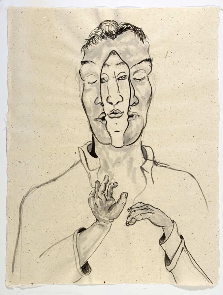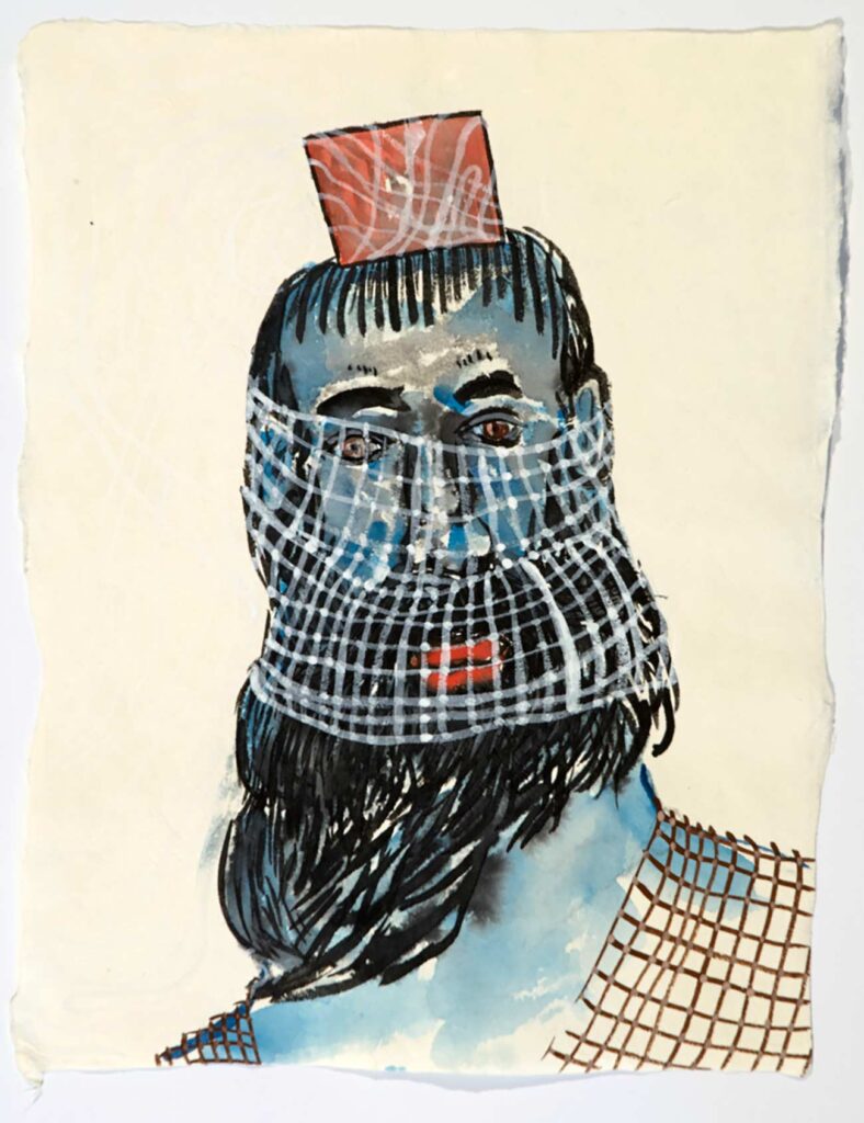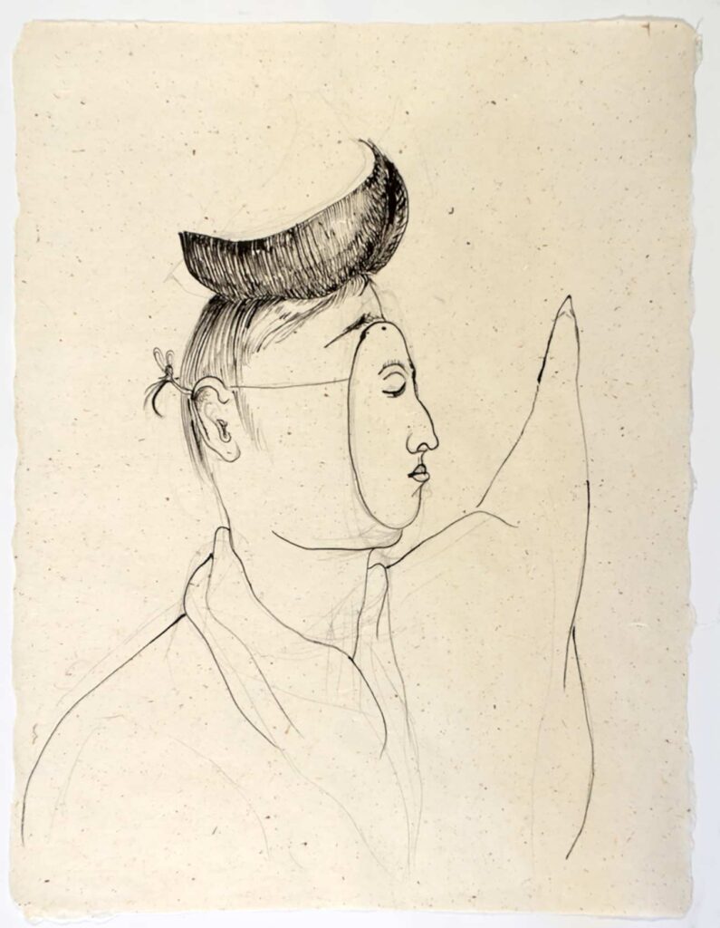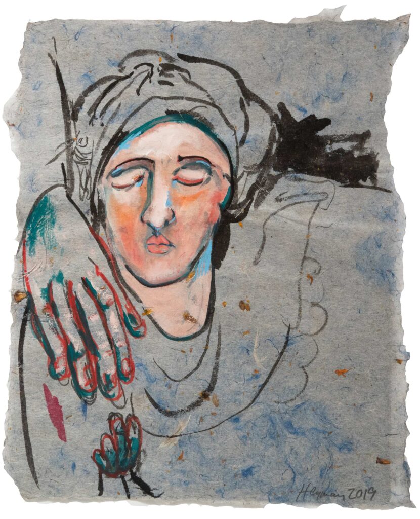 One or two is a painting made with gouache or watercolors, but I am as likely to refer to all these works as drawings, the way Jean Cocteau refers to all art as poetry. I might have dipped a bamboo brush in dark black sumi ink, or used a graphite pencil, or used a fat and well pointed round brush with its endless variety of line widths to draw colored lines in gouache paint, but my goal Is always to produce something worth looking at. Sometimes I pen rigid line over rigid line building up form and structure in pale imitation of Rembrandt and Durer; sometimes I let ink flow out like a puddle of rainwater. While 2 images might be of the same thing — for example a child’s face — one might be in walnut ink and the other in gouache, significantly altering their meanings. Much of the paper I made myself; other sheets were handmade by paper masters in Japan, where since 2011 I go to work regularly.