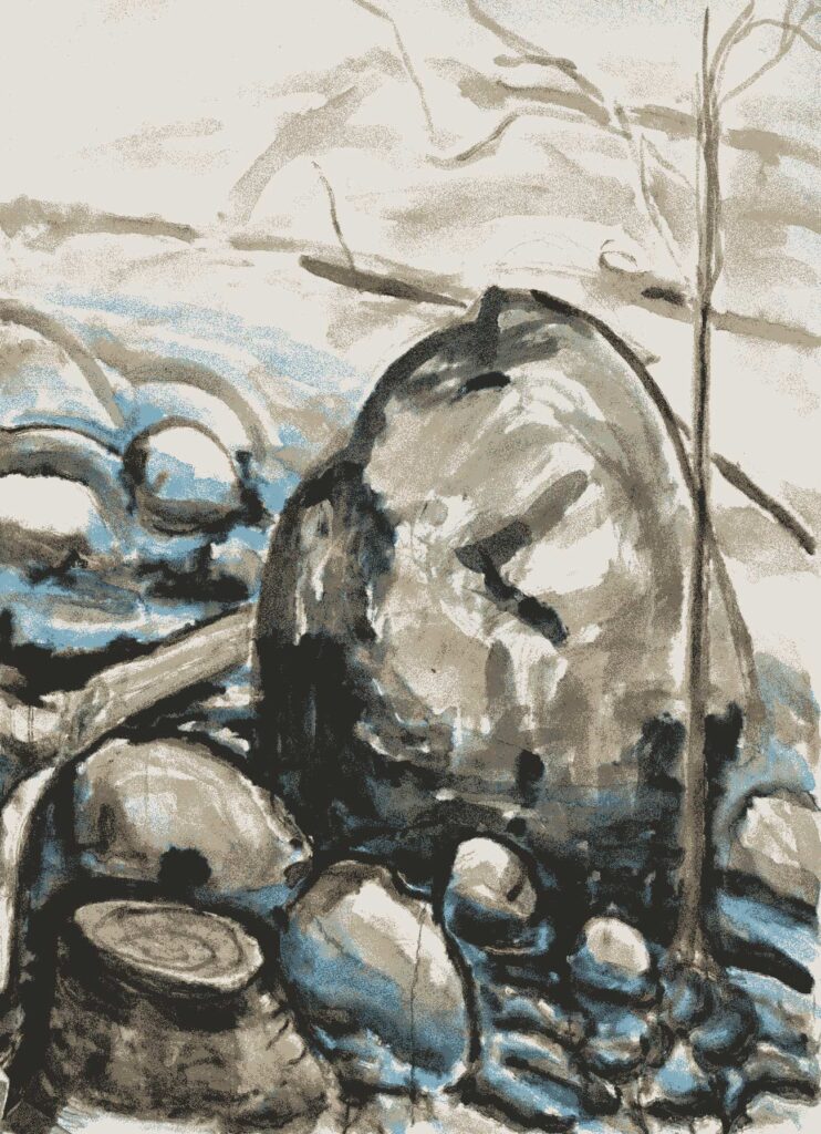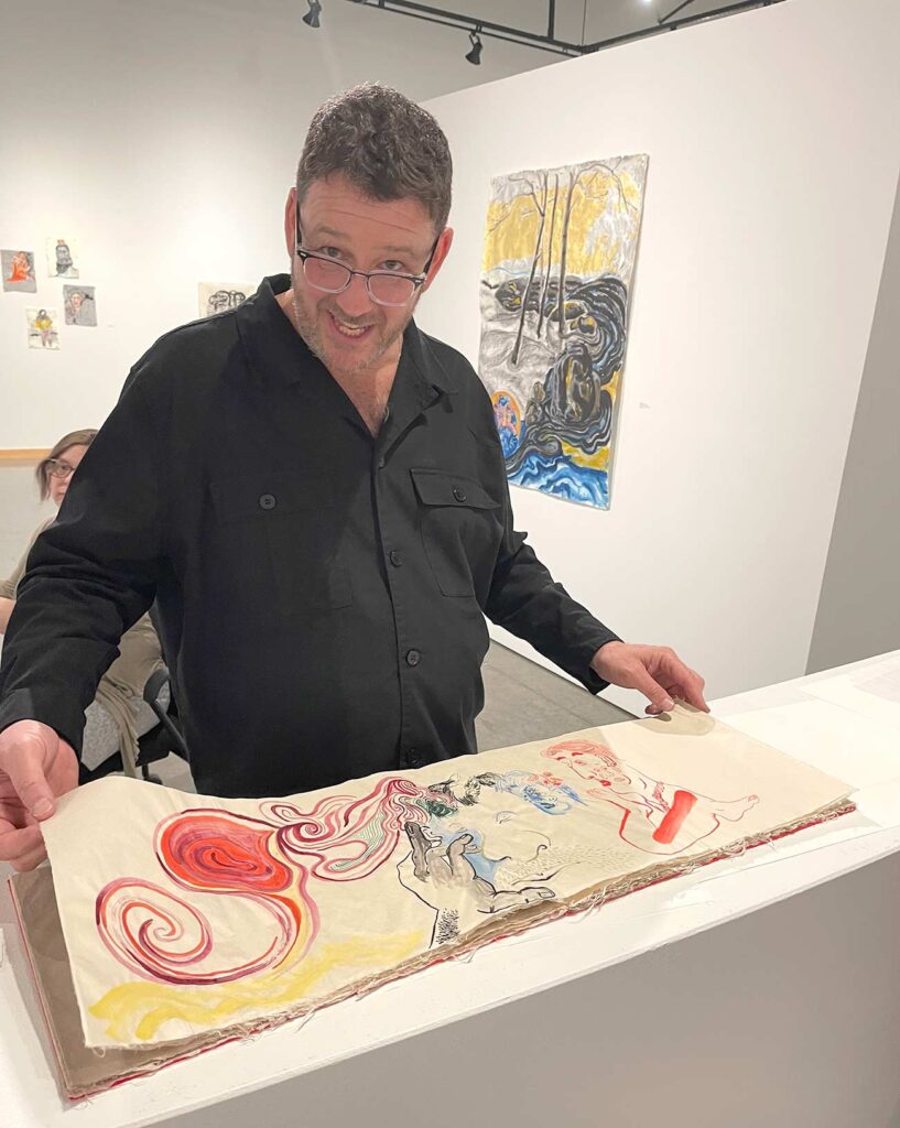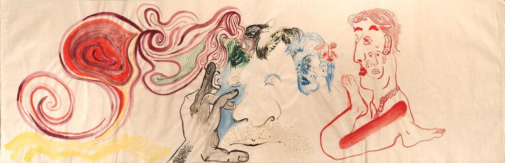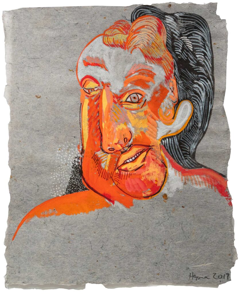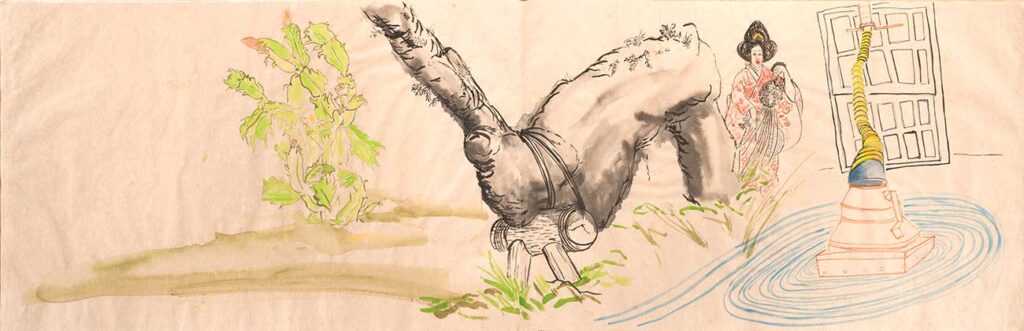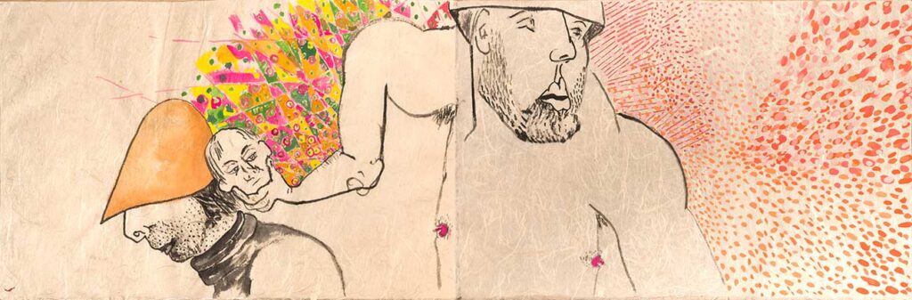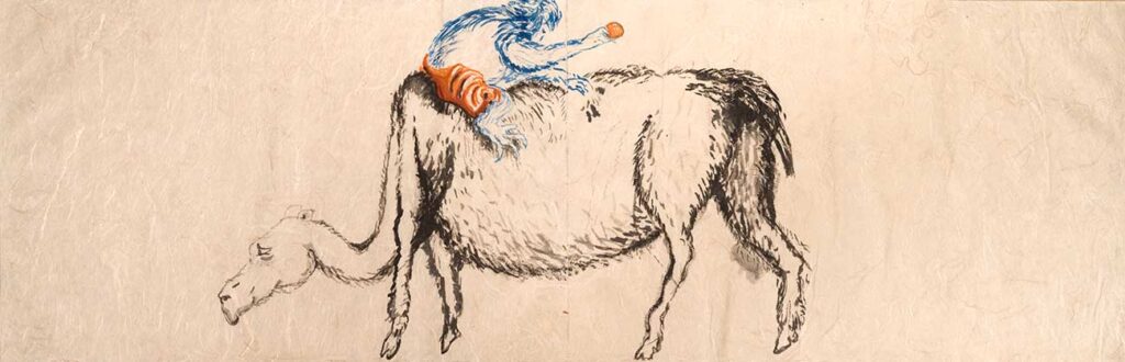 One or two is a painting made with gouache or watercolors, but I am as likely to refer to all these works as drawings, the way Jean Cocteau refers to all art as poetry. I might have dipped a bamboo brush in dark black sumi ink, or used a graphite pencil, or used a fat and well pointed round brush with its endless variety of line widths to draw colored lines in gouache paint, but my goal Is always to produce something worth looking at. Sometimes I pen rigid line over rigid line building up form and structure in pale imitation of Rembrandt and Durer; sometimes I let ink flow out like a puddle of rainwater. While 2 images might be of the same thing — for example a child’s face — one might be in walnut ink and the other in gouache, significantly altering their meanings. Much of the paper I made myself; other sheets were handmade by paper masters in Japan, where since 2011 I go to work regularly.